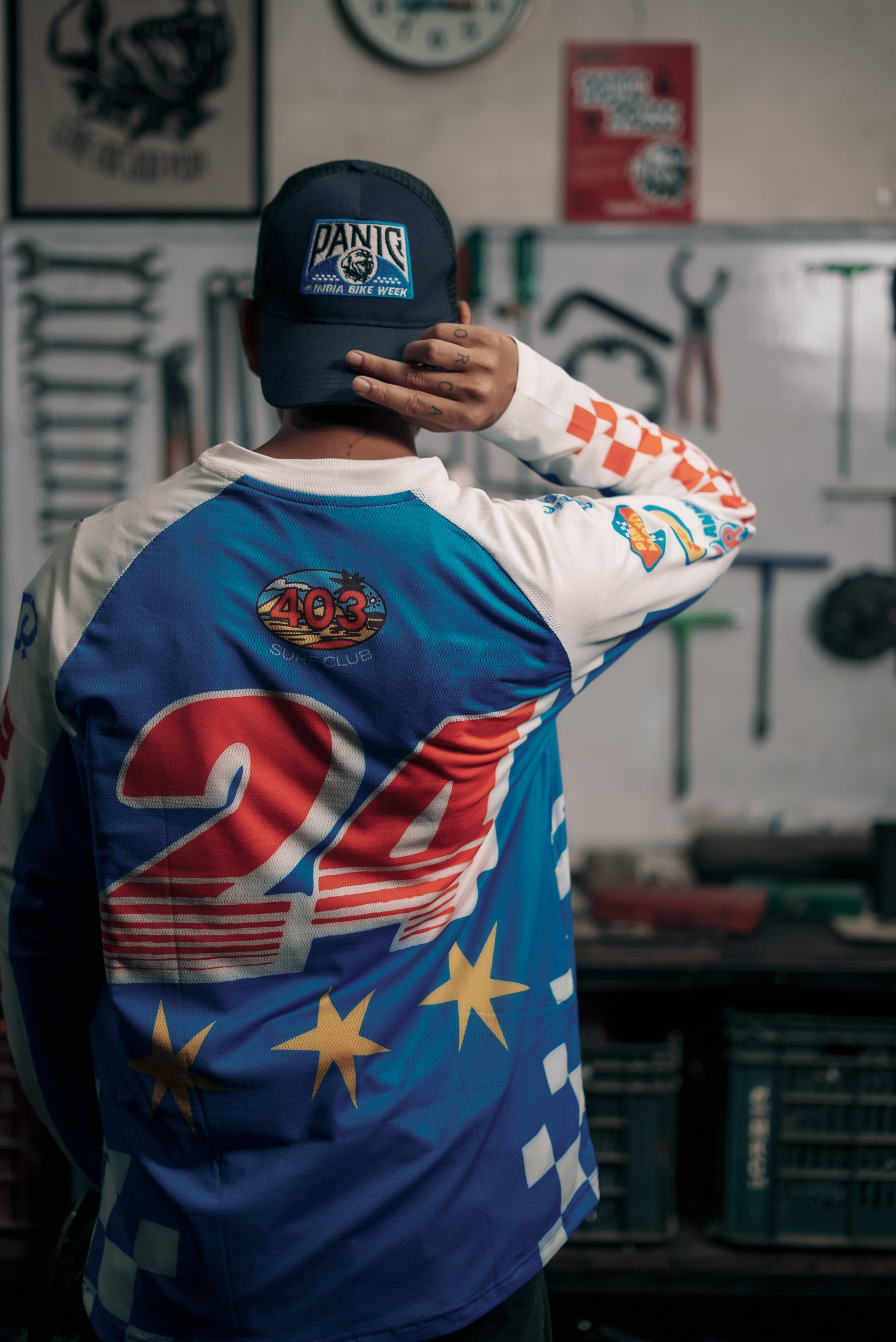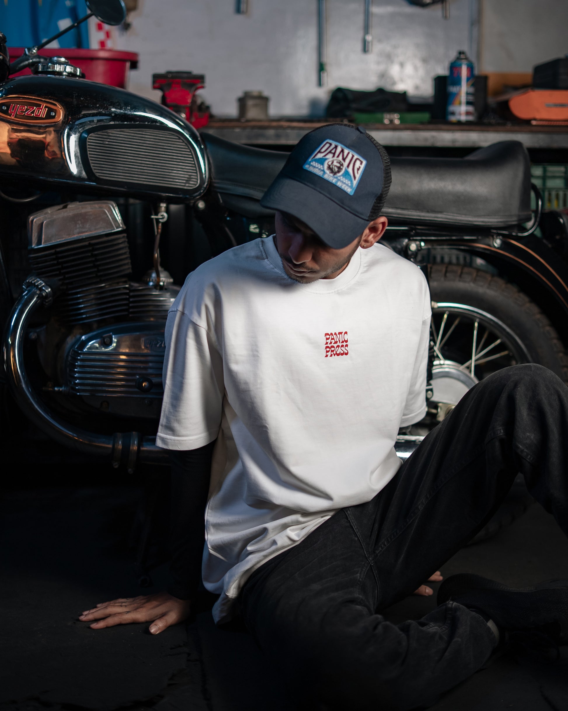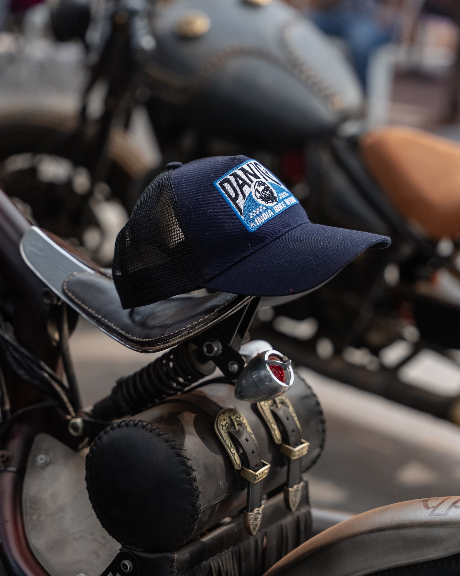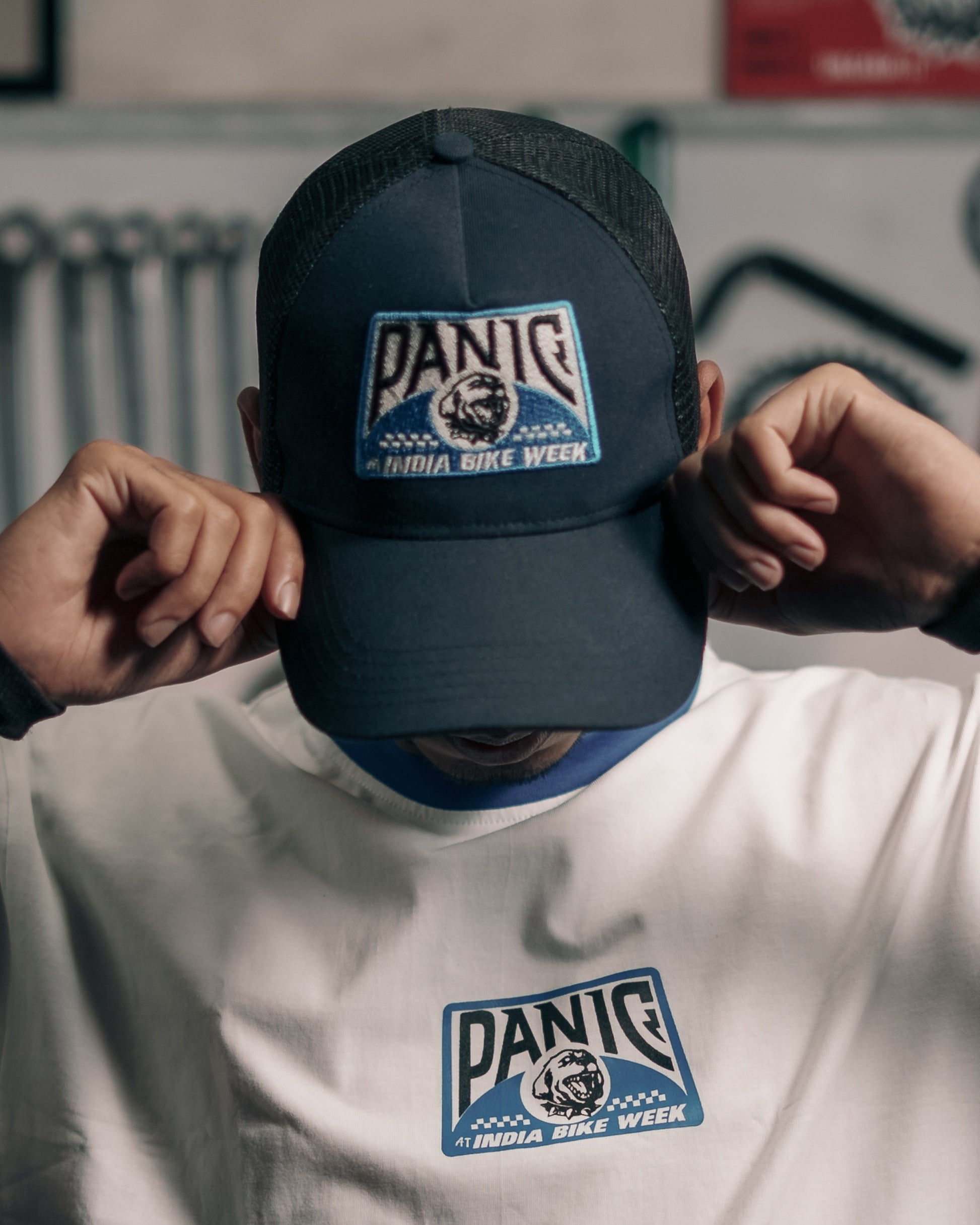 Mesh Trucker Cap with custom Panic Press patchwork, made for India Bike Week 2024.